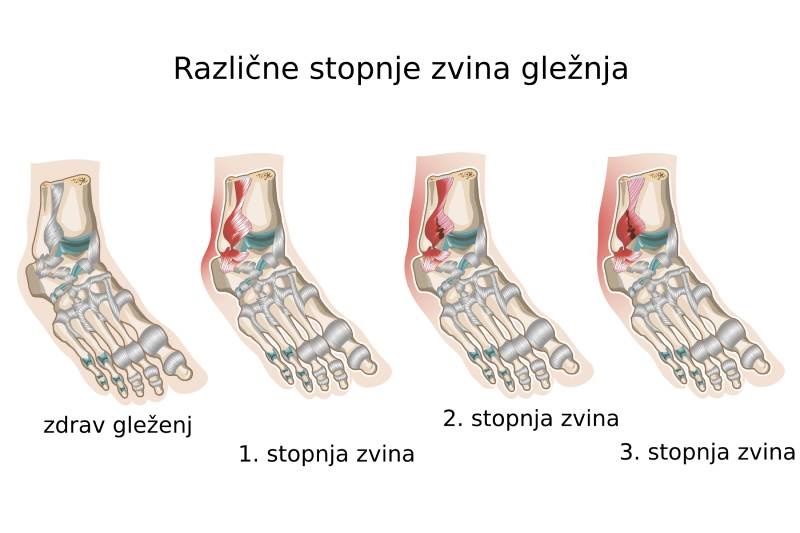 - Blag zvin (I. stopnja): vezi se raztegnejo, vendar se ne pretrgajo. Bolečina in oteklina nista hudi, vendar je zaradi ohlapnih vezi večja možnost ponovne poškodbe.